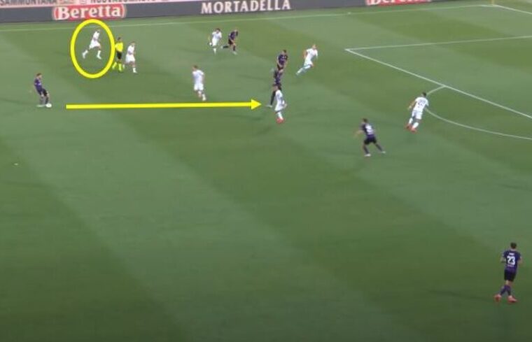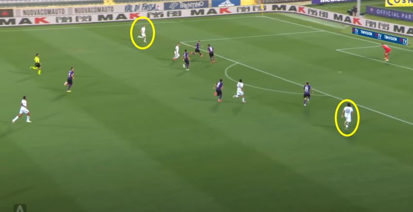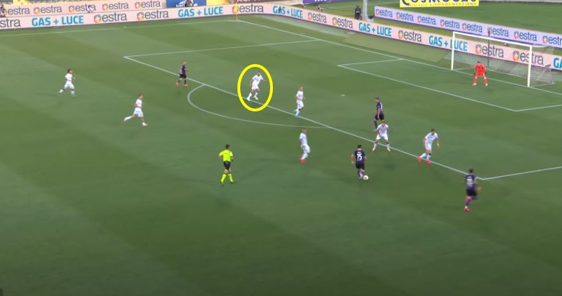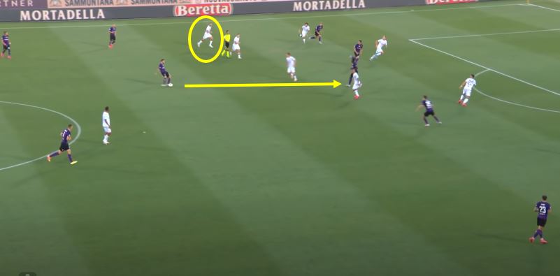 In un’altra occasione Walukiewicz si fa trovare fuori posizione, mettendo cosรฌ in difficoltร la difesa e non permettendo l’uscita su Duncan di uno dei due compagni di reparto. Il palo colpito dal centrocampista ex Sassuolo nasce appunto dallo scavalcamento del polacco, salito in pressione oltre la trequarti, e da un’altra conferma relativa piรน a Birsa, in difficoltร nel ruolo di playmaker quando chiamato a leggere certe situazioni. Duncan si propone infatti tra le linee, molto strette in verticale, ma troppo aperte in orizzontale, nessuno dei due mediani accorcia per tempo chiudendo la linea di passaggio e i difensori non possono salire sull’avversario perchรฉ giร accoppiati ai due giocatori della Fiorentina piรน avanzati.