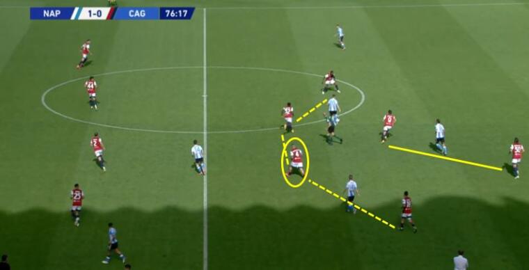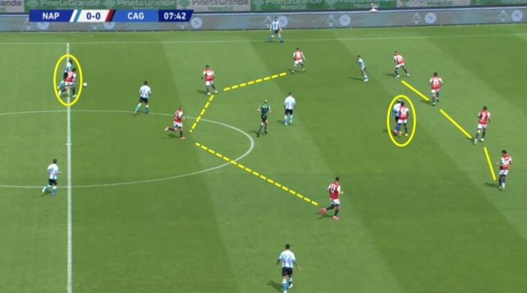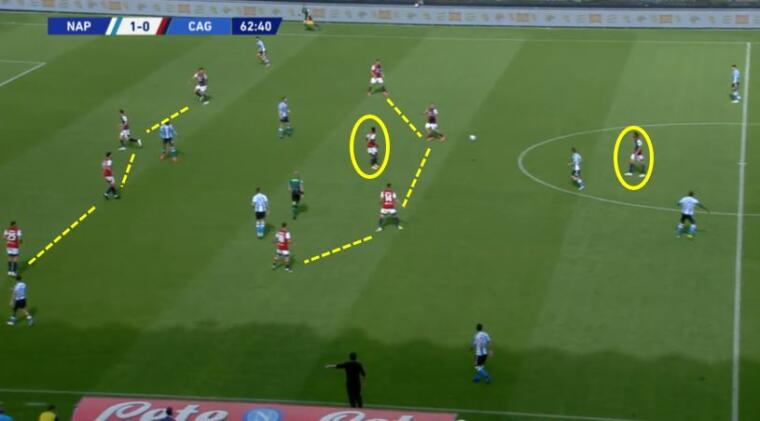 Semplici ha schierato la sua squadra con un 4-1-4-1 che aveva in Duncan e Pavoletti i due perni, uno davanti alla difesa e l’altro come unico centravanti. Il lavoro di Nainggolan e Deiola garantiva invece una pressione sui due mediani partenopei, ma anche la protezione al ghanese riportato nel ruolo di mediano. Gli esterni di centrocampo Nández e Lykogiannis non solo fungevano da supporto ai due terzini Zappa e Carboni, ma quando possibile si alzavano in aiuto al centravanti. Vedremo più avanti l’importanza del numero 18 uruguaiano a riguardo, ma anche il greco – basti pensare all’occasione di testa a metà ripresa – non lesinava inserimenti in territorio nemico.