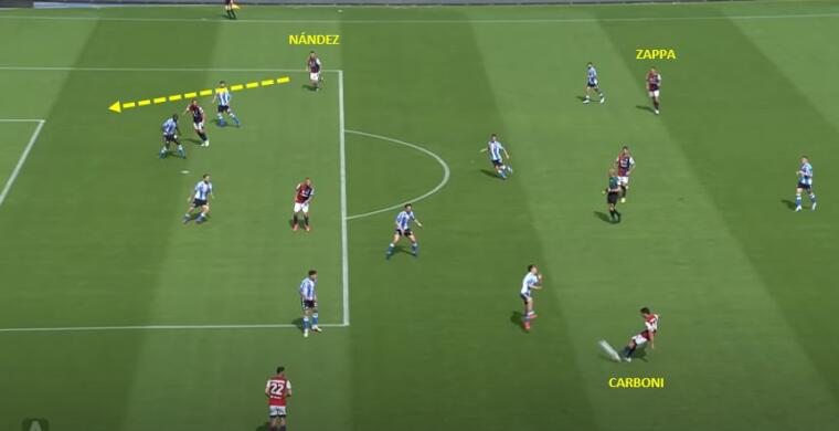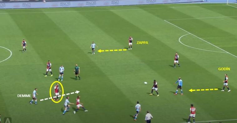 Il Napoli decide però di non assecondare immediatamente il movimento di Insigne, ma di creare un secondo triangolo lungo tra Zielinski e Koulibaly. Nández non chiude alle proprie spalle, Duncan resta sempre statico come nella prima parte della giocata. Giocata che, in maniera simile, porterà anche alla traversa di Demme in un’altra occasione.