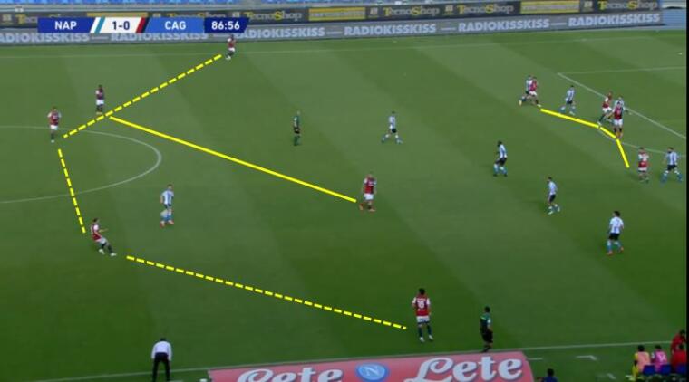 Il gol del vantaggio sempre dell’attaccante nigeriano è figlio di errori di tutta la squadra e non solo della difesa. Partendo da Carboni e la sua rimessa laterale battuta a metà tra Pavoletti che si propone e Nainggolan che non fa altrettanto. Il belga, inoltre, non taglia fuori il possibile inserimenti di Demme tra lui e il pallone, creando così i presupposti per il pallone dal mediano a Insigne. Non va dimenticata infine la deconcentrazione che causa la totale assenza delle cosiddette marcature preventive. Zappa è lontano da Insigne, GodÃn e Ceppitelli da Osimhen.