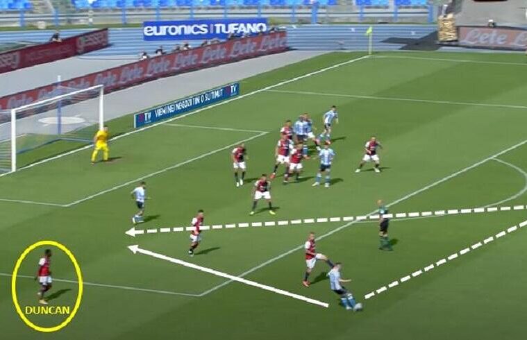 Un’altra mancanza del Cagliari in chiave difensiva è arrivata nei calci d’angolo a sfavore. Il Napoli non ha tanti giocatori fisicamente importanti, per questo motivo ha provato a sorprendere i rossoblù con giocate corte e tagli. Come si può notare Duncan non è reattivo, la possibile triangolazione lunga tra Zielinski e Insigne non viene coperta dal ghanese che resta a guardia del meno pericoloso Ruiz.