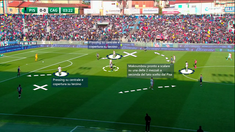 Come spesso avviene nell’ultimo periodo, la fase di non possesso del Cagliari è stata caratterizzata da un uso particolare delle due punte, i quali avevano il compito sia di pressare i centrali che complicare il possesso avversario sui terzini mentre Mancosu seguiva a uomo il vertice basso. Il portiere del Pisa Nicolas è molto bravo nel gioco con i piedi e riusciva spesso a saltare la pressione di Lapadula e Prelec trovando direttamente il terzino alle loro spalle. I rossoblù però si sono fatti trovare molto preparati anche contro questa soluzione: Lella e Nandez inizialmente stavano vicino alla mezzala, con Makoumbou che stazionava centralmente a zona; non appena il terzino riceveva, la mezzala rossoblù usciva su di lui abbandonando il suo uomo che veniva preso dal compagno di reparto congolese. Per il Pisa era quindi difficile costruire dal basso ed era costretto molto spesso a lanciare lungo, ma Dossena riusciva quasi sempre ad avere la meglio nei duelli aerei.