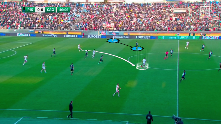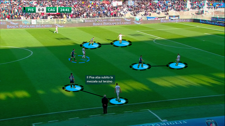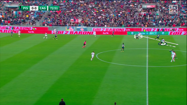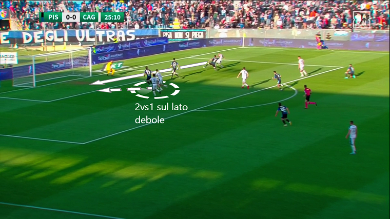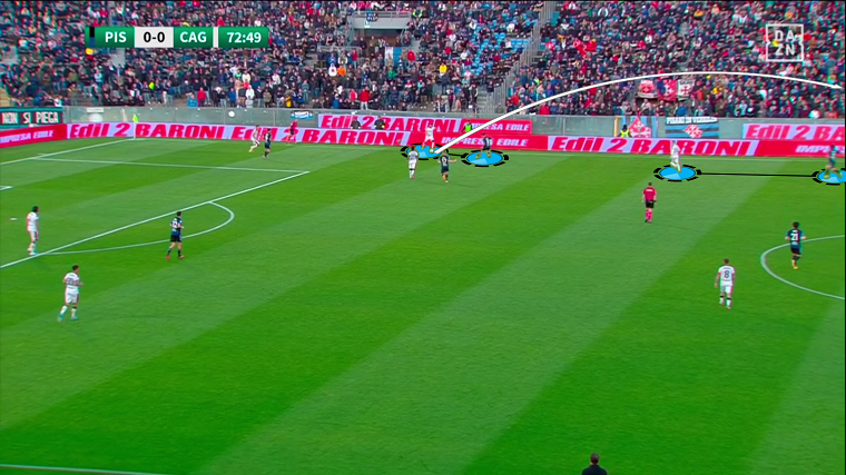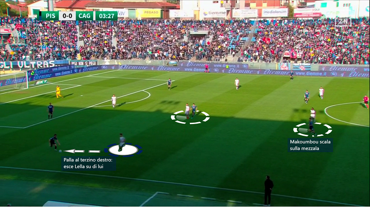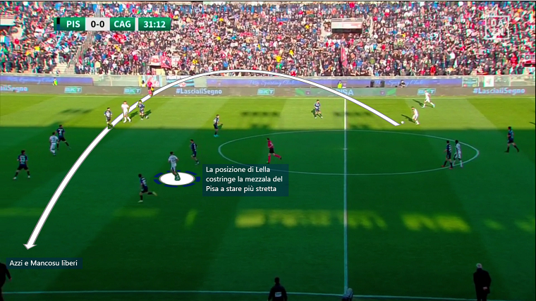 Un’altra soluzione molto efficace trovata dalla squadra di Ranieri consisteva nello sfruttare lo spazio alle spalle dei “pressatori” del Pisa. Per esempio, quando il Cagliari costruiva a sinistra era Marin l’incaricato ad alzarsi su Azzi; a quel punto Lella si muoveva lateralmente alle spalle del centrocampista romeno, costringendo quindi il terzino Calabresi a salire su di lui. A quel punto spettava a Mancosu allargarsi dietro il terzino ex Cagliari, attirando quindi la marcatura del centrale Caracciolo e creando i presupposti per attaccare con Lapadula e Prelec.