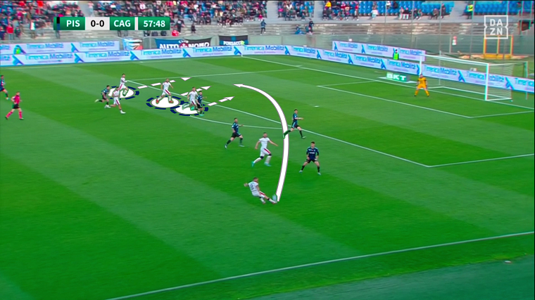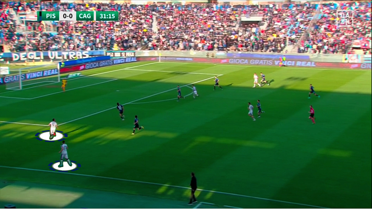 Le due squadre di fatto condividevano lo schema di gioco (4-3-1-2), per cui è stato molto interessante notare le differenze nell’approccio alla prima pressione. Il Pisa andava uomo su uomo con le due punte e il trequartista sui centrali e il vertice basso, con le mezzali che fin da subito si alzavano sul terzino lato palla (a differenza di quanto faceva il Cagliari che copriva la linea di passaggio con la punta e alzava la mezzala solo in un secondo momento). Si tratta di una pressione molto aggressiva, il cui limite è l’occupazione ottimale del campo che rende ancora più difficoltosa la marcatura di un giocatore fluido posizionalmente come Mancosu. Il primo problema riguarda la copertura centrale, perché con la mezzala spostata sull’esterno gli altri due centrocampisti sono costretti a dover difendere in una zona molto ampia di campo, compito ancora più difficile da eseguire quando devi anche cercare di tenere d’occhio il trequartista sardo pronto a posizionarsi nelle zone di campo più pericolose. Spesso, infatti, il Cagliari riusciva a superare facilmente la pressione del Pisa sfruttando la qualità in impostazione di Obert che riusciva a trovare libero Mancosu tra le maglie larghe dei centrocampisti toscani.