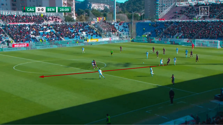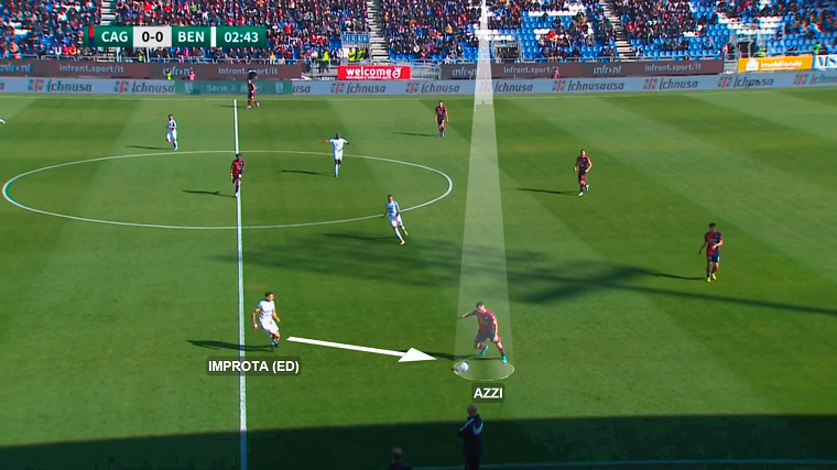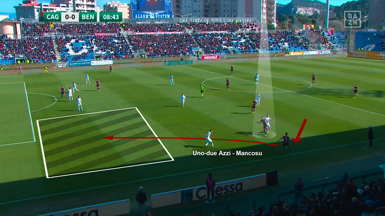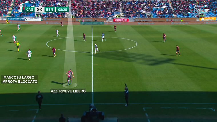 Le soluzioni più interessanti però sono state quelle costruite sulla fascia sinistra, con l’asse Azzi – Mancosu (a cui poteva aggiungersi Obert) che si è rivelato un rebus quasi irrisolvibile per i ragazzi di Stellone. Cagliari e Benevento giocavano pressoché a specchio, ciò rendeva più chiari e facili i riferimenti da avere in fase di pressing per entrambe le squadre. Quando il Cagliari costruiva con Azzi sulla sinistra, sull’italo-brasiliano usciva immediatamente l’esterno destro del Benevento Improta. La fluidità posizionale di Mancosu si è rivelata fondamentale anche in queste situazioni: il trequartista sardo a volte si posizionava largo a sinistra, bloccando Improta e permettendo ad Azzi di ricevere totalmente libero e con campo davanti dove condurre. Da una situazione simile si è creata una delle occasioni più interessanti dei rossoblù a seguito di un bell’uno-due tra il 5 e il 37.