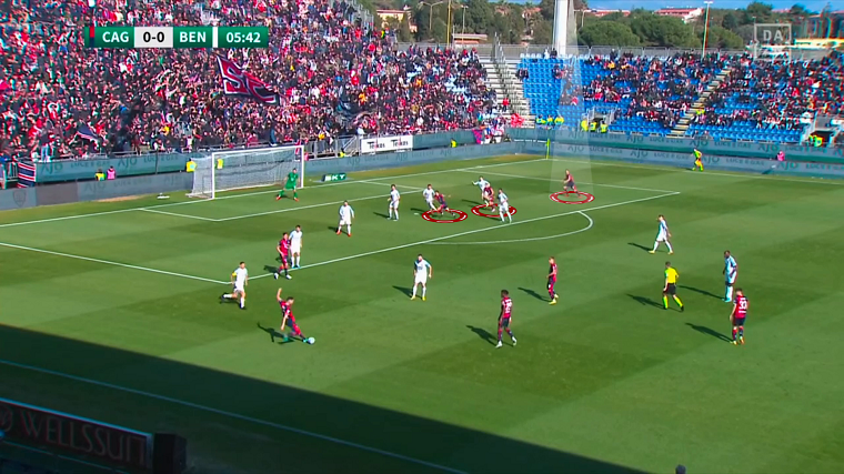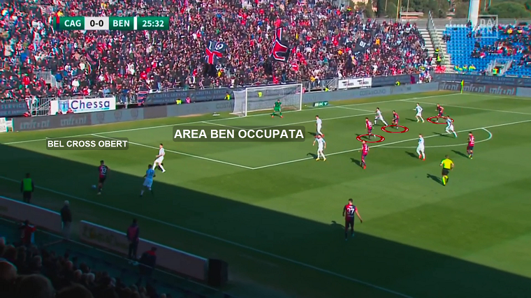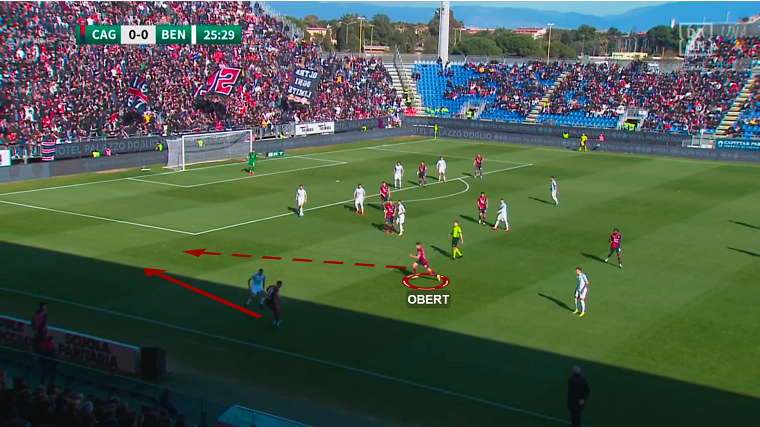 Per quanto riguarda l’occupazione dell’area erano prevedibili dei miglioramenti con l’inserimento di Prelec al posto di una seconda punta come Luvumbo. Tuttavia, anche nei momenti in cui lo slovacco si allontanava dalla sua zona per combinare con i compagni, l’area non rimaneva sguarnita grazie alla posizione più avanzata di Mancosu. In aggiunta, la presenza di Obert, molto più adatto di Capradossi a svolgere il ruolo di braccetto sinistro con propensione offensiva e perfettamente complementare per giocare con Azzi, permetteva ai due attaccanti di focalizzarsi più sull’attaccare l’area senza dover abbassarsi per giocare con i compagni.