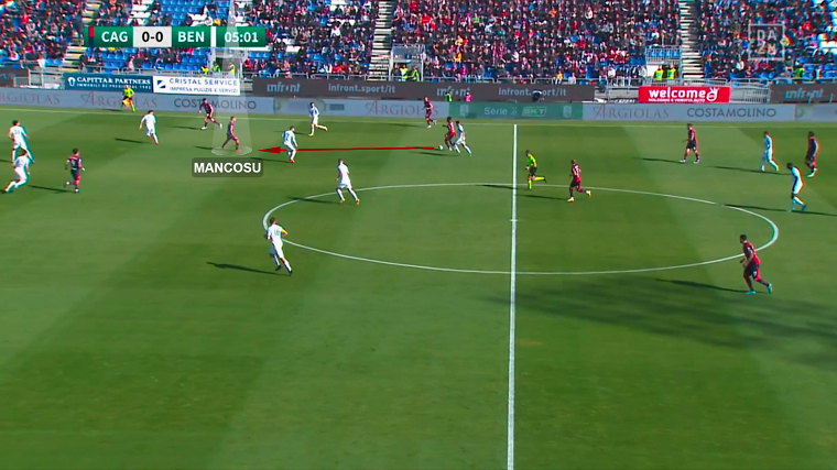 Era dal 27 novembre nella gara in trasferta contro la capolista Frosinone che Marco Mancosu non vedeva il campo. E con il senno di poi si può dire che la sua assenza ha pesato parecchio. I primi 45 minuti del numero 5 sono stati di altissimo livello sia con la palla che senza. Sono stati ben quattro i passaggi chiave (ossia passaggi che portano direttamente a un tiro) serviti dall’ex Lecce, tra cui la perla di sinistro con cui ha mandato Prelec davanti al portiere. Non può di certo sorprendere l’alto tasso tecnico di Mancosu, ma in realtà l’apporto più grande l’ha dato senza la palla tra i piedi con i suoi movimenti a spaziare su tutta la trequarti. Il passaggio al 3-4-1-2 contro la difesa a 3 del Benevento permetteva a Mancosu di posizionarsi tra le linee e creare un dilemma ai centrali campani: rompere la linea per marcare il trequartista sardo con il rischio di lasciare spazio a Lapadula e Prelec oppure tenere la linea e lasciarlo ricevere e girare liberamente? Entrambe le soluzioni potevano essere problematiche.
