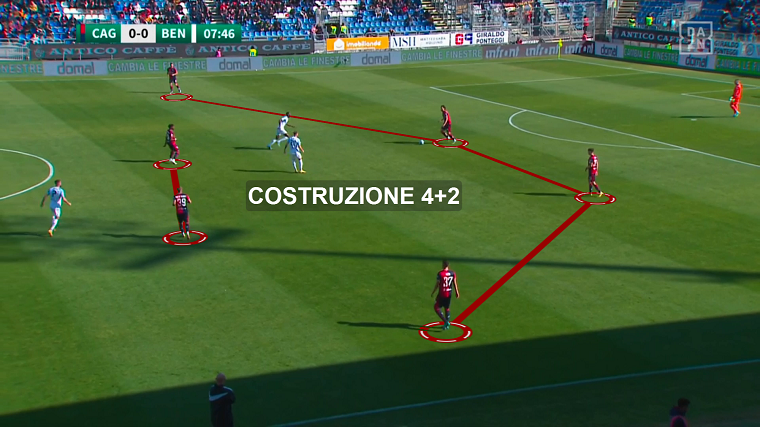 Nel corso delle ultime analisi abbiamo individuato alcune problematiche costanti della squadra di Ranieri, ossia i limiti in fase di costruzione che obbligavano a vani lanci lunghi e la pessima occupazione dell’area in assenza di Pavoletti. Sotto questi punti di vista si sono visti dei miglioramenti nella gara contro il Benevento. Il primo punto lo abbiamo già anticipato parlando dei movimenti di Mancosu per liberare le conduzioni di Azzi, ma vale la pena sottolineare alcuni accorgimenti tattici proposti dai rossoblù in possesso a seconda della situazione. La struttura della squadra di Ranieri era un 4+2 in prima costruzione, con Azzi che abbassava la sua posizione da terzino sinistro e Altare che si allargava da terzino destro. La posizione più larga di Altare permetteva a Zappa di alzare la propria posizione per poter cercare direttamente degli inserimenti alle spalle della linea difensiva, così da limitare il numero di tocchi nella propria metà campo.