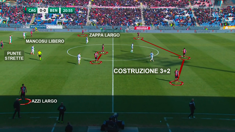 A possesso consolidato, quando il Benevento rinunciava alla pressione e il Cagliari diventava padrone del gioco, la struttura diventava un 3+2, con Zappa e Azzi alti e larghi per dare ampiezza, Lapadula e Prelec molto stretti per facilitare le combinazioni e il solito Mancosu libero di muoversi dove meglio credeva.