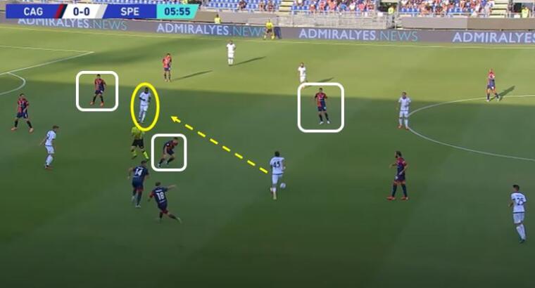Il difensore polacco è stato protagonista, spesso forzato, anche delle difficoltà del Cagliari a produrre gioco per gran parte della gara. La squadra giocava spesso affidandosi a Cragno, con trame lente che vedevano in Walukiewicz il giocatore costretto ad affidarsi nuovamente al proprio portiere. L’unica alternativa diventava così la palla verticale, alta o a mezza altezza, raramente rasoterra, con GodÃn e Strootman nelle vesti di regista. Quando lo Spezia dopo il raddoppio si è rilassato, il Cagliari ha trovato maggiore spazio tra le linee. Marin è così salito di giri, andando a riempire la trequarti offensiva e cercando combinazioni rapide e sullo stretto con Joao Pedro