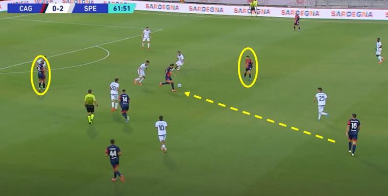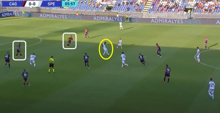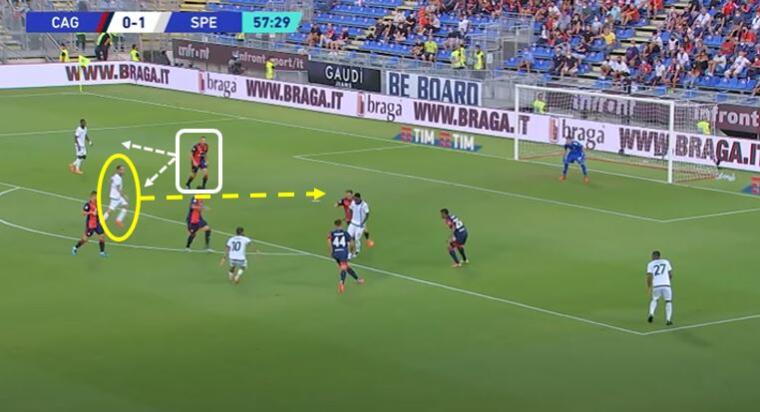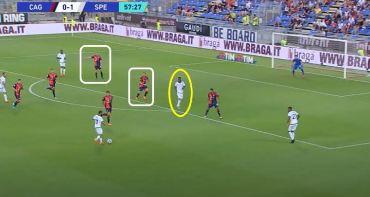 Il primo gol di Joao Pedro nasce da una verticale rasoterra di Strootman e una delle tante sponde, soprattutto aeree, di Pavoletti. Marin ha lo spazio per scegliere i tempi giusti, serve il numero dieci brasiliano e sfrutta quella che era stata la difficoltà del Cagliari fino a quel momento. Anche nel raddoppio i rossoblù trovano lo Spezia scoperto ed è Pereiro ad attaccare la zona lasciata sguarnita. Inserimenti centrali palla al piede e spazio da attaccare sulla trequarti, l’arma degli uomini di Motta fino a quel momento e che diventava così l’arma del Cagliari.