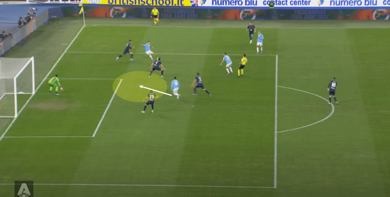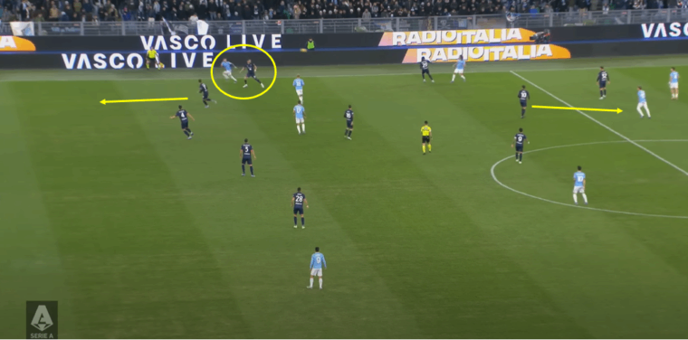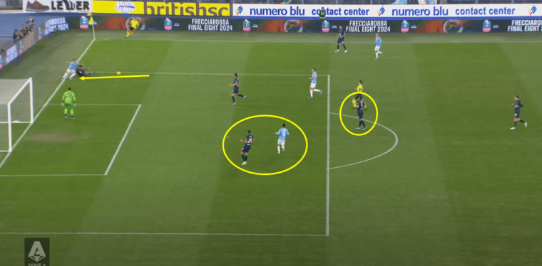 Il triangolo lungo tra Lazzari, Isaksen e Guendouzi sfrutta di fatto lo spazio lasciato libero da Hatzidiakos e la poca aggressività di Azzi in chiusura sulla fascia. Makoumbou si lascia prendere il tempo dall’avversario diretto, aspetto che può succedere, mentre manca la copertura di chi avrebbe dovuto leggere la situazione avendo la visuale per farlo. Nel caso in esame è Dossena a mancare all’appello. Eppure il centrale di Ranieri, per il resto protagonista di un’ottima prova di fronte a Immobile, inizialmente aveva capito l’evoluzione della giocata della Lazio, muovendosi con l’idea di andare a chiudere la diagonale alle spalle di Hatzidiakos – altissimo su Isaksen – e supportare così Makoumbou nella verticale di Guendouzi.