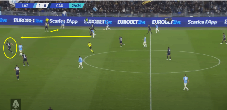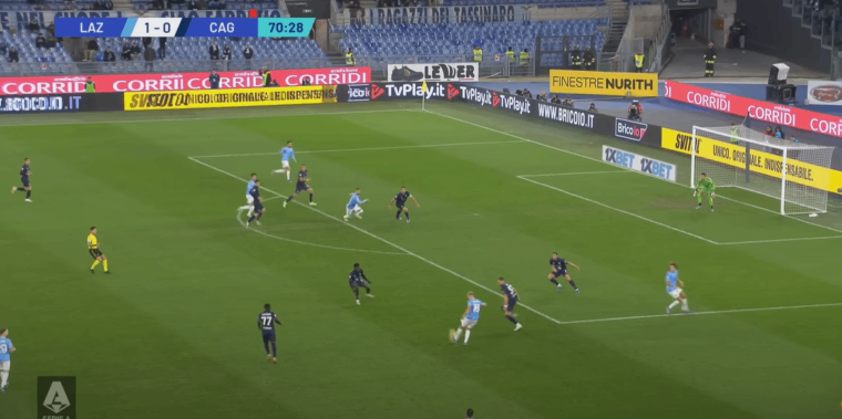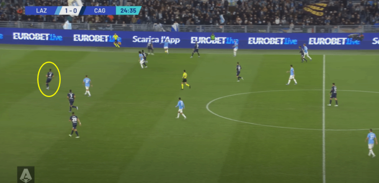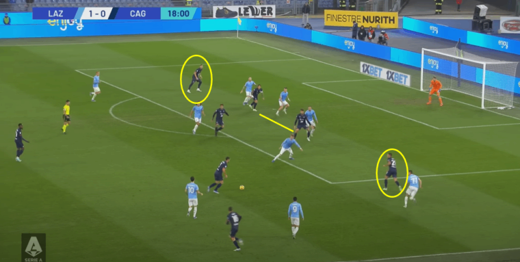 Se da una parte la retroguardia più folta aveva dato l’idea di una tattica atta più a contenere che a offendere, l’occasione capitata sulla testa di Lapadula quando ancora le squadre erano in parità numerica evidenzia la voglia del Cagliari di provarci. Sì tre difensori, ma anche due esterni che non avevano disdegnato la spinta – si vedano le posizioni di Zappa e Azzi nella situazione indicata – più Viola a fare da collante tra centrocampo e attacco in una zona che ha messo in difficoltà la difesa biancoceleste. E, soprattutto, due punte di ruolo a dividersi l’area in orizzontale, creando un uno contro uno che ha visto Gila e Patric perdere le distanze. Infine il braccetto di destra Goldaniga pronto a supportare l’azione d’attacco, è lui che dalla trequarti di destra d’attacco calcia il pallone che poi il numero nove rossoblù spedirà di testa alla sinistra della porta di Provedel.