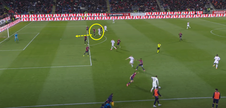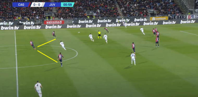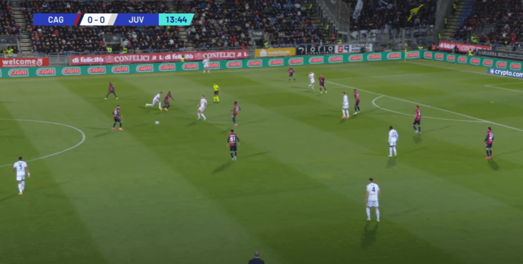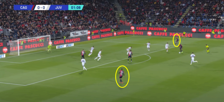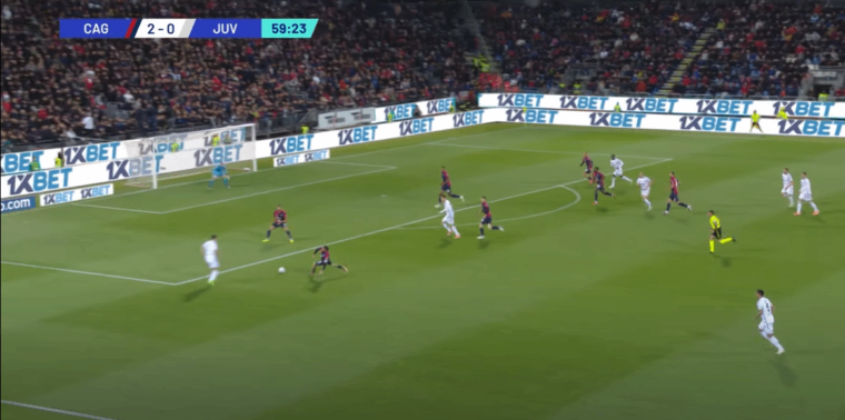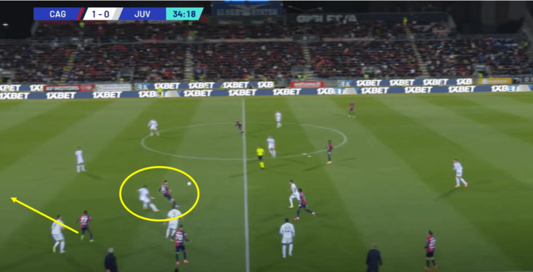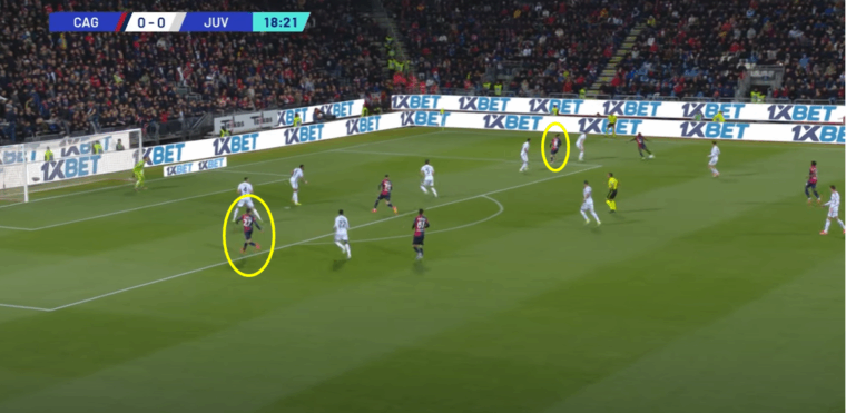 Il gol del pareggio arrivato su autogol di Dossena nasce dall’uscita palla al piede del difensore che, non trovando sbocchi, non riesce né a liberarsi della sfera né a farsi commettere fallo. A quel punto la perdita del possesso comporta prima l’allargamento del gioco da parte dei bianconeri verso Yildiz, poi il ritardo del centrale ex Avellino nel ristabilire la copertura adeguata in mezzo all’area. Il giovane attaccante della Juventus è bravo nel gesto tecnico, un cross perfetto a rientrare che sorpassa Mina, ma allo stesso tempo la posizione di Dossena nel tentativo di recuperare centralmente è l’ulteriore causa dell’intervento goffo e alla disperata per anticipare l’accorrente Milik. Una frazione di secondo decisiva, con un effetto domino che porta alla rete del 2-2 finale e alla vera e propria beffa per il più bel Cagliari della stagione.