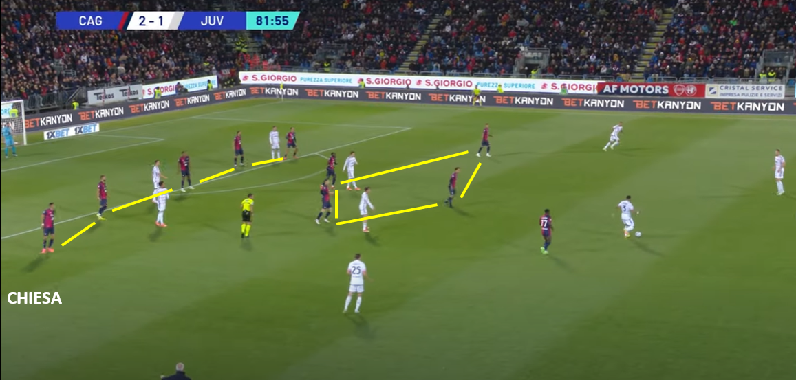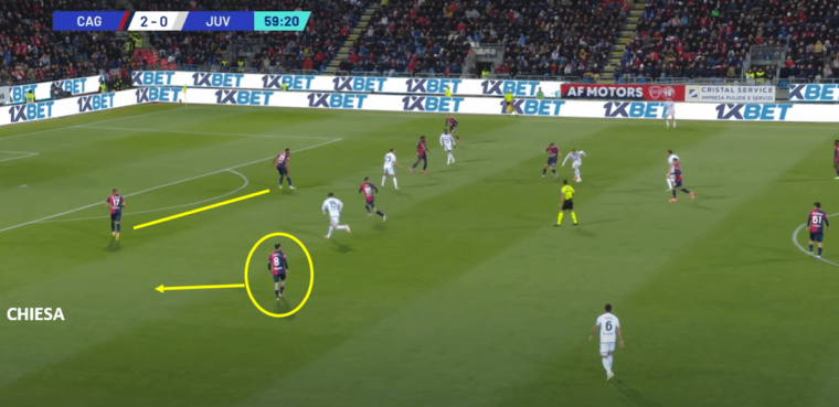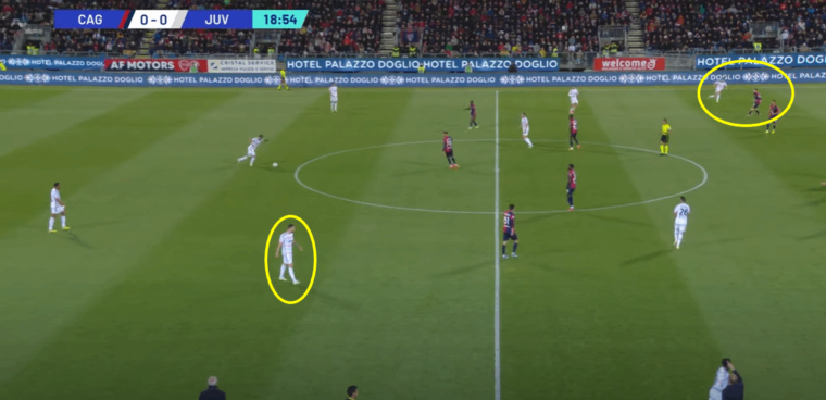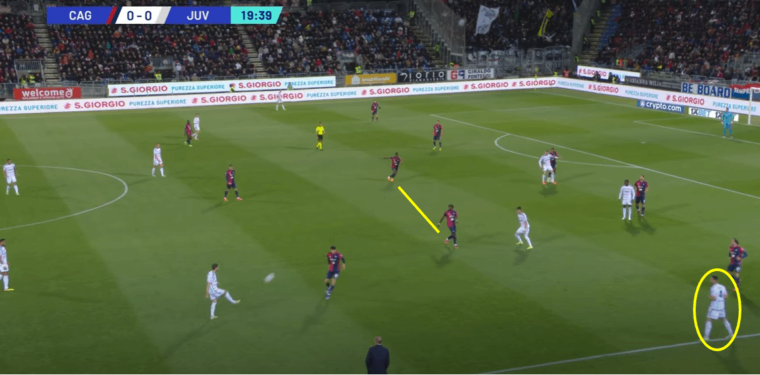 L’impossibilità di raggiungere l’area rossoblù con la manovra ragionata fa sì che la Juventus inizi a giocare su due tipologie di azione. La prima il lancio dalle retrovie a scavalcare la pressione mediana del Cagliari. Chiesa prova così a prendere alle spalle Nández, riuscendoci, mentre sono la posizione e l’attitudine di Gatti da braccetto di destra a invitare Ranieri al cambio di sistema.
