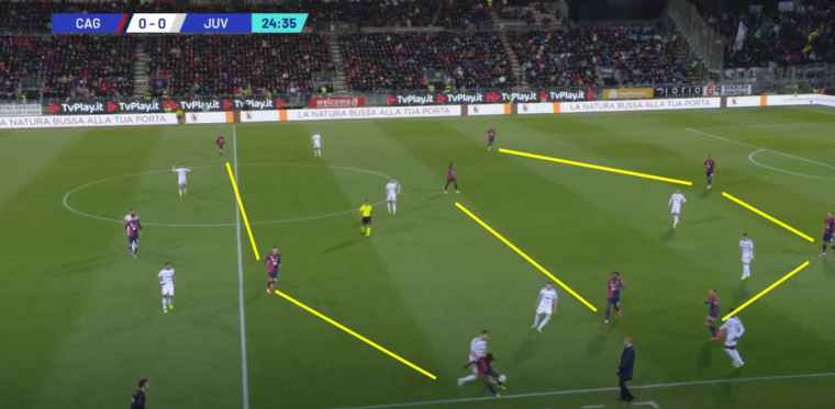 Ranieri non ha puntato sull’uomo su uomo a tutto campo, almeno per i primi venti minuti. Bensì il 3-4-2-1 o 3-4-3 che si voglia schierato in modo da non forzare la prima pressione, per poi aggredire la Juventus non appena la palla arrivava nella metà campo rossoblù. Il trio offensivo restava così pronto per le transizioni rapide, mentre i bianconeri non riuscivano a sfondare le linee di centrocampo e difesa del Cagliari per via della compattezza e dell’intensità nell’aggressione.