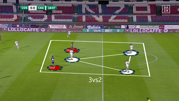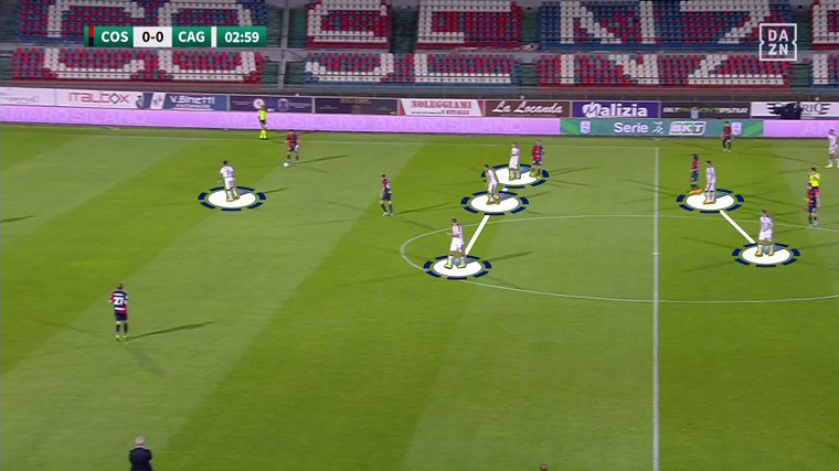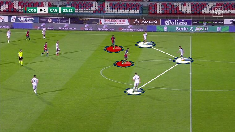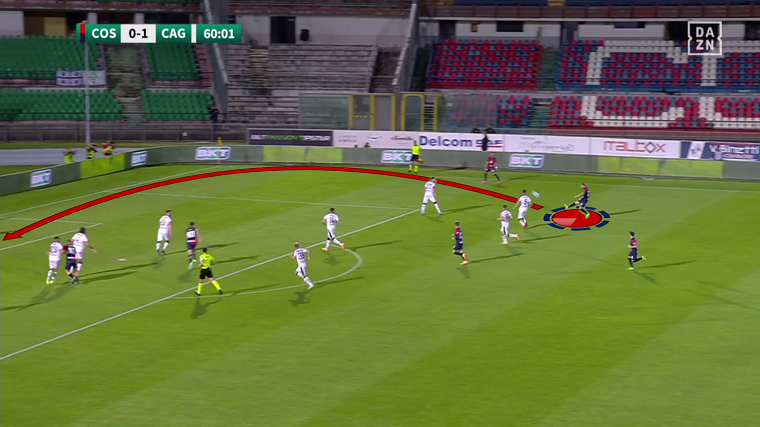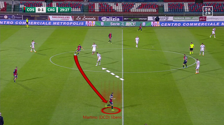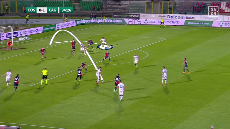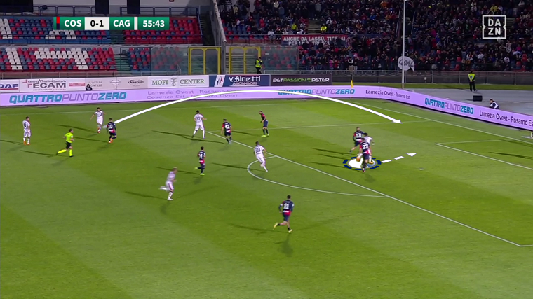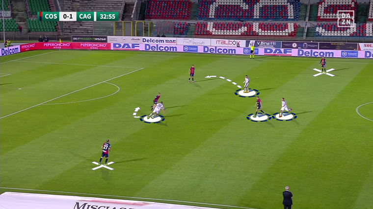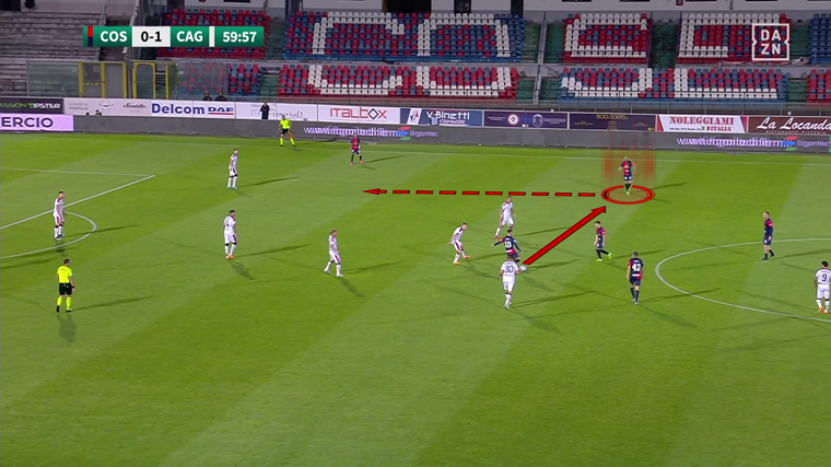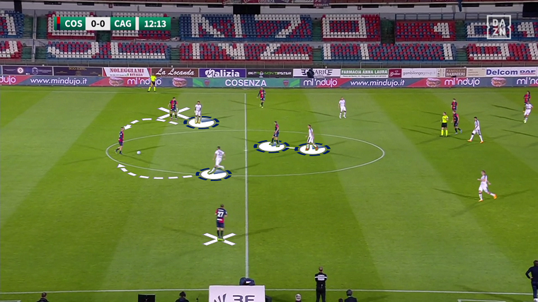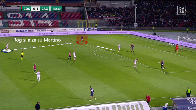 Spesso però il Cosenza è riuscito a sfruttare la struttura stretta del Cagliari, trovando con tanto spazio il braccetto destro Martino passando a momenti a una costruzione a quattro. Ranieri ha messo una pezza a questo problema chiedendo a Rog di stare fin da subito più largo, per poi uscire sul numero 27 avversario quando questo riceveva il pallone.