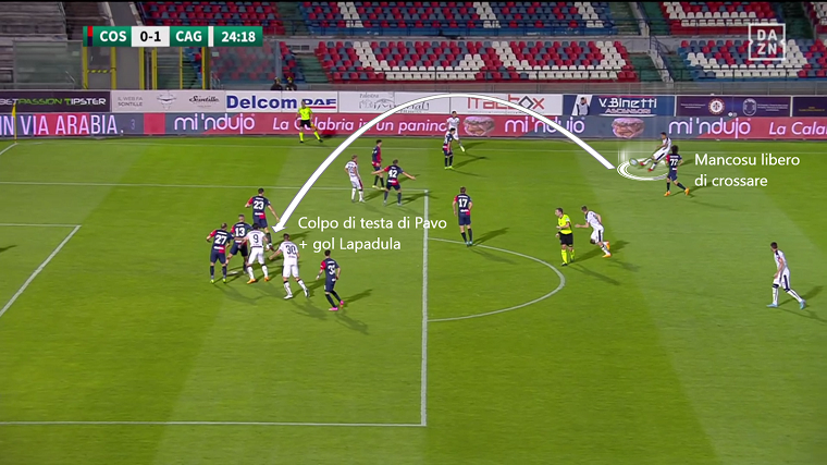 Nel caso del gol, il trequartista sardo riceve totalmente libero da una rimessa laterale di Zappa e ha quindi tutto il tempo e lo spazio per alzare la testa e trovare Pavoletti che di testa impegna Micai e permette a Lapadula di trovare la ventunesima rete del campionato, la più facile di tutte. Anche nelle grandi occasioni capitate al 35’ e al 55’ i protagonisti sono stati sempre la regia offensiva del numero 5 e il killer instinct del numero 9.