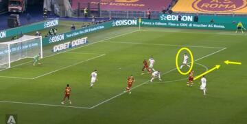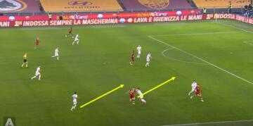 Nel momento in cui Nández calcia il pallone verso l’area, Joao Pedro è bravo a passare davanti a Mancini, così come lo è Lykogiannis nel continuare la corsa a supporto tenendo impegnato Maitland-Niles e liberando il brasiliano dalla doppia marcatura. Zappa e Deiola continuano la corsa per un’eventuale respinta corta al limite dell’area, lasciando di fatto 5 giocatori ad attaccare l’area giallorossa.