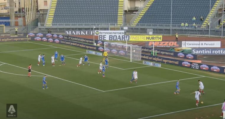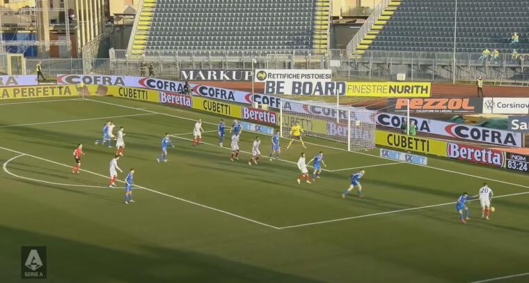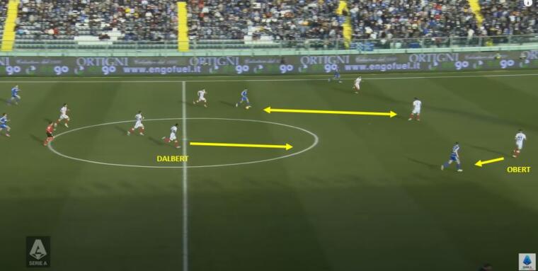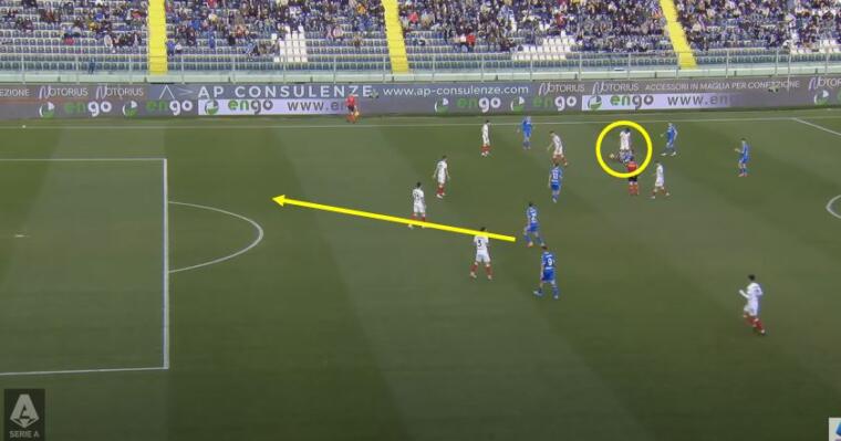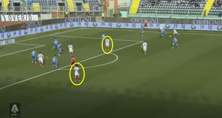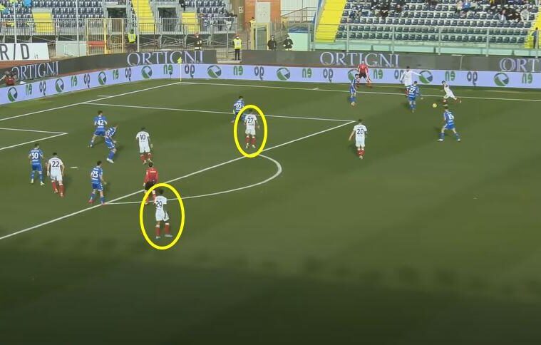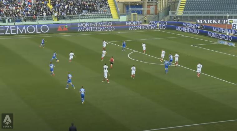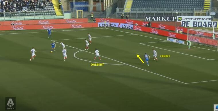 Il gol è anche una logica conseguenza dell’uscita dal campo di Lovato. Goldaniga tiene la linea troppo distante dalla zona di sviluppo dell’azione, costringendo la difesa a indietreggiare per aiutare il rientro dei compagni rimasti in avanti. Giusta la scelta iniziale, meno quella di non uscire mai e portare l’Empoli fin dentro la propria area. Da notare sia la posizione di Dalbert, ottimo inizialmente in ripiegamento, e quella di Obert, che sembra in controllo di Pinamonti.