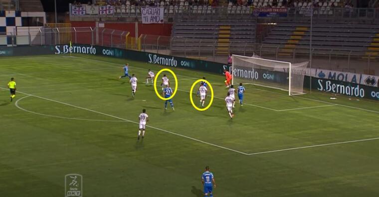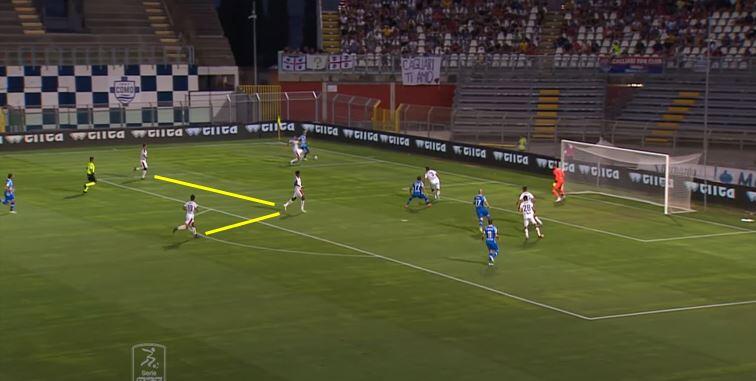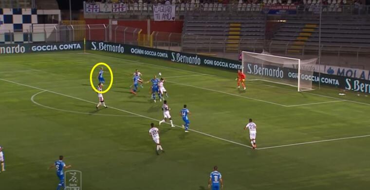 Una volta partito il traversone, il centravanti del Como sovrasta il duo di centrali rossoblù pur senza colpire la sfera. Obert non riesce a contrastarlo, mentre Goldaniga alle sue spalle è coperto e vede tardi il pallone che spiove alle spalle di Cerri. Di Pardo, anche lui coperto, non ha i tempi di reazione giusti per chiudere e resta a metà tra la marcatura di Mancuso e quella di Blanco.