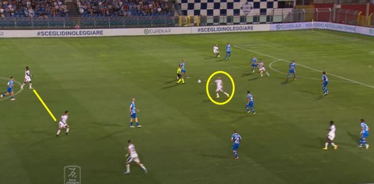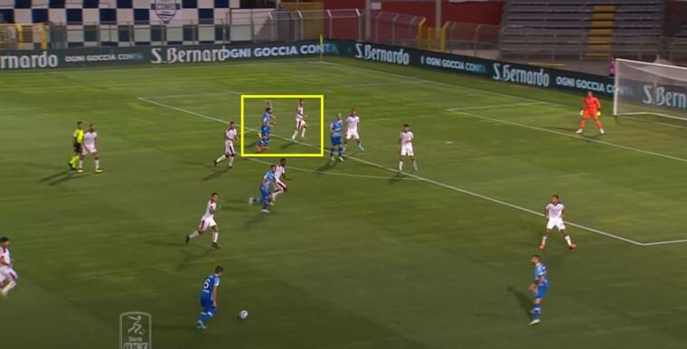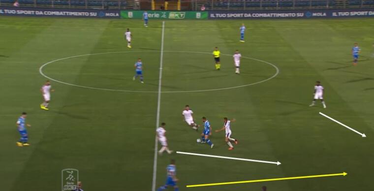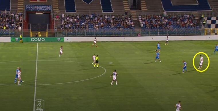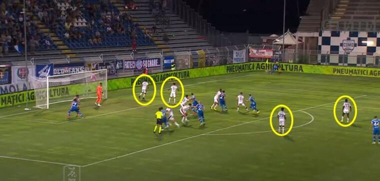 Il Como, una volta vinti due duelli sulla trequarti d’attacco, porta la palla sulla destra verso Iovine che si propone in zona avanzata. Viola è in ritardo nella chiusura e il terzino avversario ha tutto il tempo di preparare ed eseguire il cross. Sul lato opposto si può notare il due contro uno Blanco-Mancuso contro Di Pardo, con Goldaniga pronto a supportare Obert nel contrastare Cerri sulla palla alta.