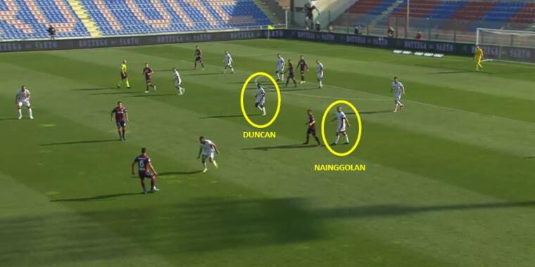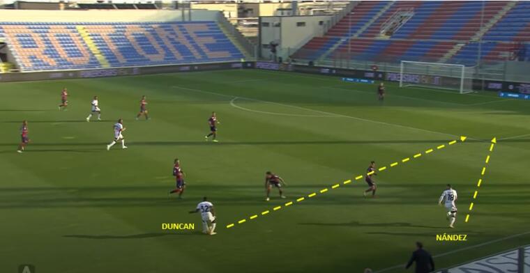 Una volta sbloccato l’aspetto mentale grazie al gol del vantaggio, a trarne giovamento sono stati proprio Duncan e Nández. In occasione del secondo gol infatti l’azione nasce dalla verticalizzazione del ghanese, tempi perfetti tra pallone e inserimento del compagno, e l’attacco dello spazio del León. Duncan in quell’occasione agiva più da mezzala, Nández poteva dal canto suo essere meno preoccupato della fase difensiva a trovare il modo di fare ciò che sa fare meglio, correre in verticale.