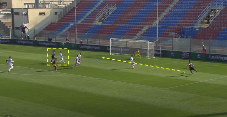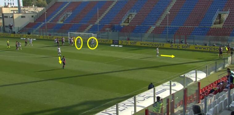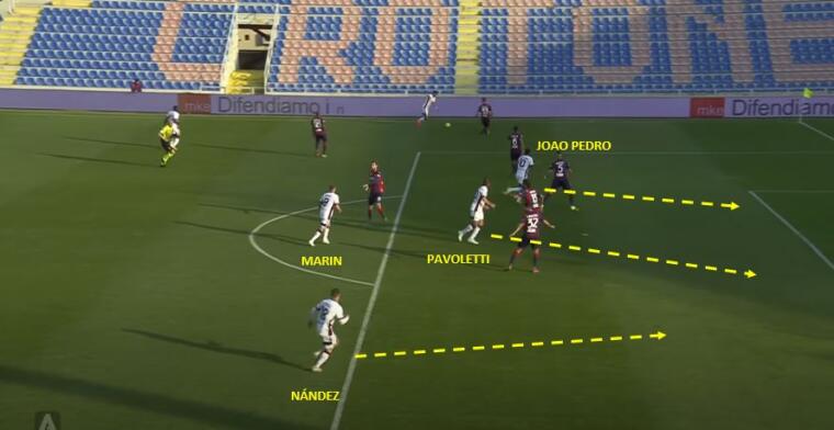 A conferma di ciò l’azione del gol del vantaggio rossoblù. Nel momento in cui Lykogiannis effettua il cross si possono notare tre aspetti chiave. Il primo è la presenza di Marin ad accompagnare la giocata per un’eventuale respinta della difesa. Il secondo è la divisione dell’area tra le due punte, Joao Pedro ad attaccare il primo palo e Pavoletti a puntare il secondo. Il terzo, non meno importante perché evita il raddoppio sul centravanti livornese, è la chiusura sul lato opposto d’attacco di Nández che chiama così a se il terzo di destra del Crotone e dà un’ulteriore soluzione sulla palla di Lykogiannis.