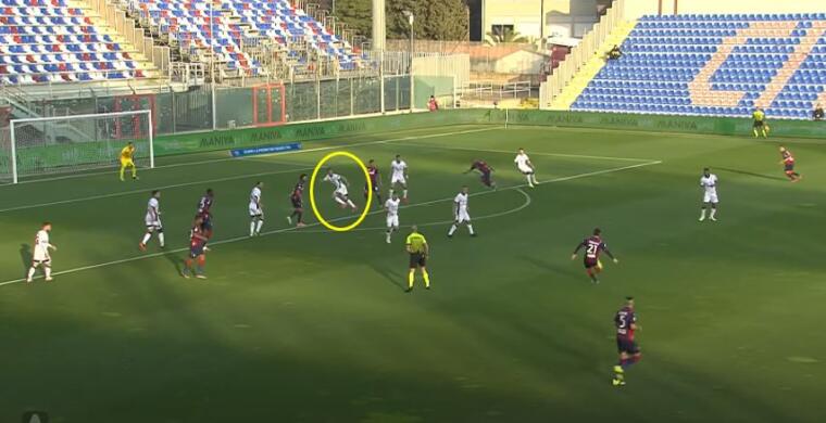 Quinti offensivi – Nel primo tempo il Cagliari ha affondato soltanto in due occasioni, entrambe con Lykogiannis ed entrambe senza mettere davvero in pericolo la porta di Cordaz. L’aspetto però più importante dei due tentativi è la presenza del greco nell’area avversaria a chiudere l’azione che partiva dal lato opposto, sulla falsariga di quanto metteva in campo Zenga durante il suo interregno.