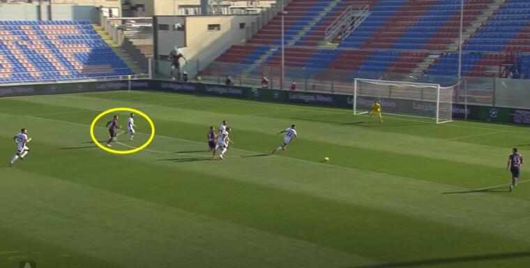 Prima che il pallone arrivi all’algerino, la giocata nasce da un lancio verticale di Zanellato per Henrique. Palla scoperta, nessuna pressione sul portatore. In questi casi la linea difensiva dovrebbe essere pronta a scappare all’indietro. L’unico a prendere le giuste contromisure è Rugani, che infatti sporcherà il tentativo di Henrique, mentre i compagni restano statici. Piccoli dettagli che possono fare la differenza, come lo stesso Deiola che lascia uno spazio troppo ampio tra sé e Lykogiannis scegliendo di mettere più attenzione sulla fascia piuttosto che sul pericolo maggiore al centro.