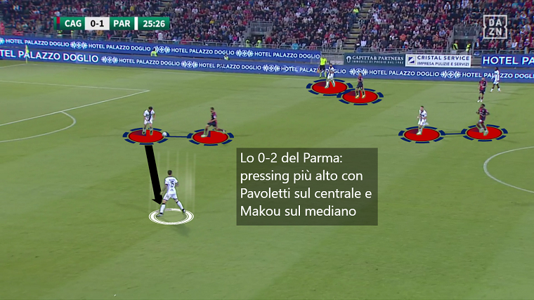 Dopo il gol dello 0-1 il Cagliari ha provato ad alzare la pressione. Pavoletti, infatti, non stava più a uomo su Bernabé ma usciva sul difensore centrale Osorio. Se il Parma stava dominando la partita in mezzo al campo prima, togliere Pavoletti dalla trequarti ha facilitato ulteriormente il lavoro ai ragazzi di Pecchia.