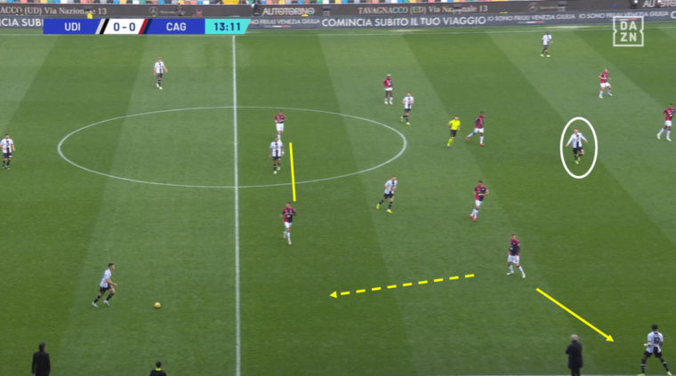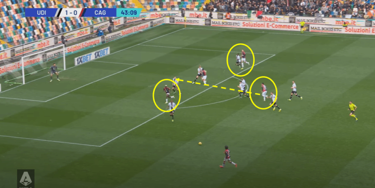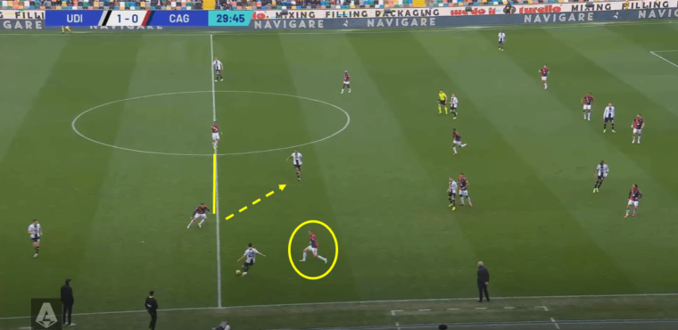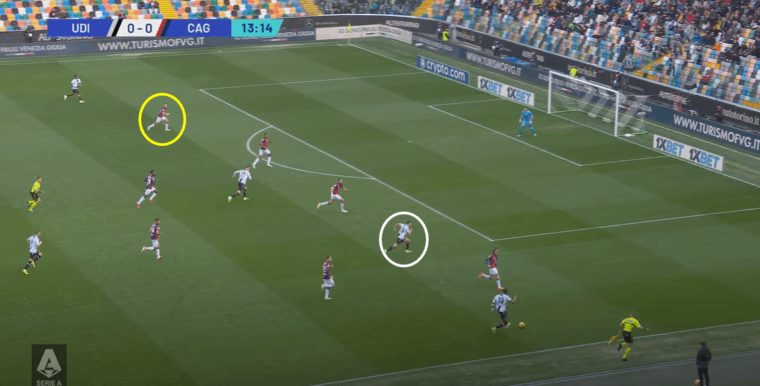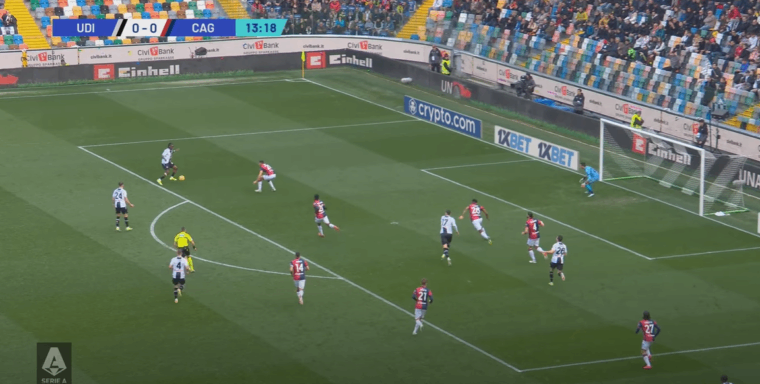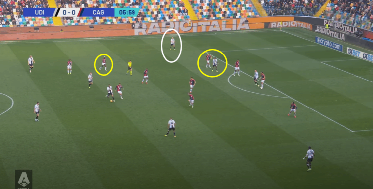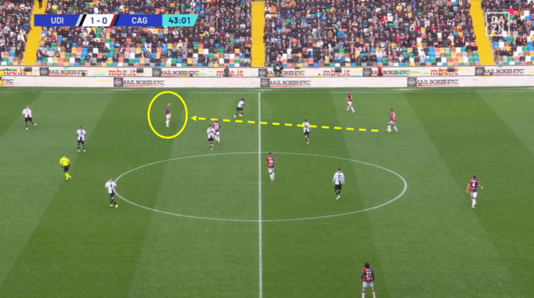 Un altro fattore positivo che si lega al cambio tattico รจ stata la capacitร del Cagliari di capire i momenti. Ossia, di non andare in pressione sempre e comunque, ma essere in grado anche di ricompattarsi sotto la linea della palla e chiudere cosรฌ spazi di giocata tra le linee all’Udinese. Una volta persa la possibilitร di creare transizioni rapide sul primo pressing, i rossoblรน indietreggiavano senza perdere la propria fisionomia e Jankto su tutti ha dato una sterzata a una prestazione fino a quel momento decisamente incolore. Se dal punto di vista tecnico l’ex Sampdoria non ha avuto chissร quale impatto nemmeno nella ripresa, da quello tattico il suo apporto รจ stato importante. Non piรน tra due fuochi, ma capace di alzarsi sul terzo di difesa (Perez) quando era possibile e, una volta non recuperato immediatamente il pallone, il ritorno sulla linea di centrocampo in copertura dell’interno e pronto a scalare sul quinto (Zemura)ย quando necessario.
