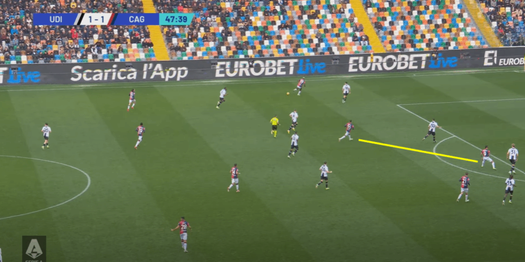 L’aver staccato Gaetano dalla linea immaginaria orizzontale con Lapadula ha cosรฌ creato anche situazioni come quella della traversa colpita dallo stesso peruviano. I movimenti del numero 70 hanno messo in difficoltร il trio difensivo, con Walace che non aveva piรน il passo per seguire il diretto avversario e soprattutto Luvumbo e Jankto piรน centrali (e centrati). Da non sottovalutare anche la propensione maggiormente offensiva degli esterni di difesa, oltre a una compattezza dei reparti anche in fase d’attacco che ha visto Dossena e Mina alzarsi fin oltre la propria metร campo spinti dallo stesso movimento in avanti del duo Deiola-Makoumbou.