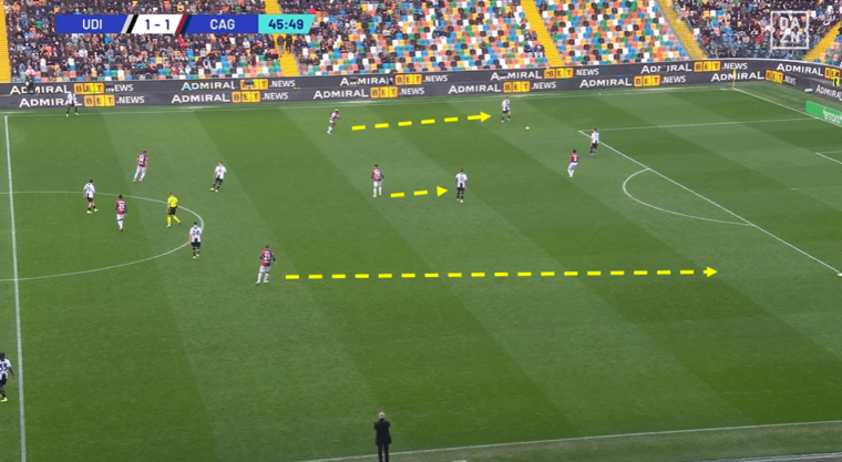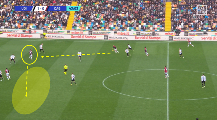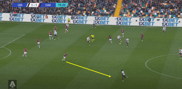 Da quel momento il numero 70 scuola Napoli si prende la scena, diventando fattore determinante sia per il pareggio dei rossoblรน sia per un secondo tempo con maggiore pericolositร e altrettanto controllo del gioco. La sua posizione tra le linee con libertร di movimento totale sulla trequarti diventa la chiave della svolta che mette in crisi l’Udinese, peraltro con un’arma simile a quella che aveva permesso ai friulani di dominare fino a quel momento. Gaetano, infatti, diventa per il Cagliari quello che era stato Thauvin nella prima mezz’ora per i bianconeri, mentre le corsie non creano piรน i problemi della prima parte di gara grazie al maggiore coordinamento tra Jankto e Zappa da una parte e Luvumbo e Augello dall’altra. Infine la presenza di Gaetano come regista offensivo vero e proprio dร a Mina e Dossena una soluzione di giocata in verticale, cosรฌ come a Deiola e Makoumbou la paritร numerica in mezzo al campo senza dover essere loro a turno ad aggredire Walace. Il gol nasce appunto da una palla diretta dal centrale colombiano a Jankto, venuto centralmente a occupare lo spazio libero.