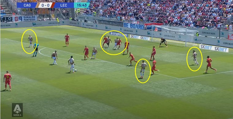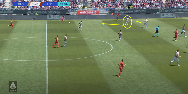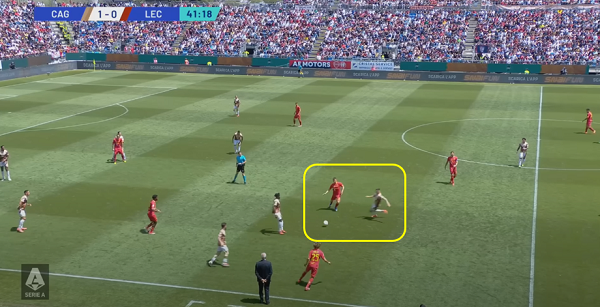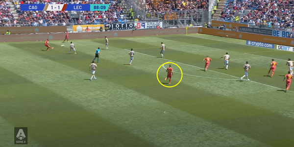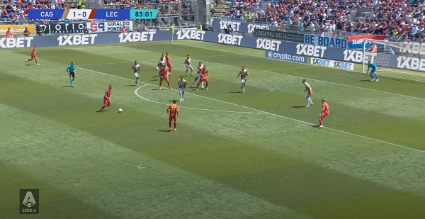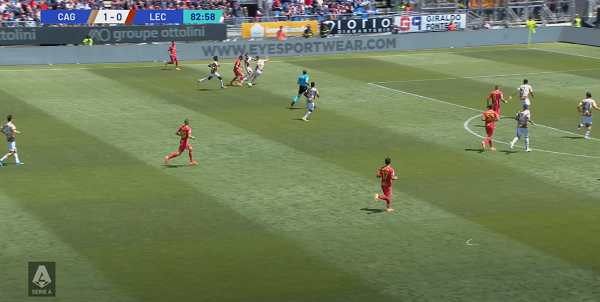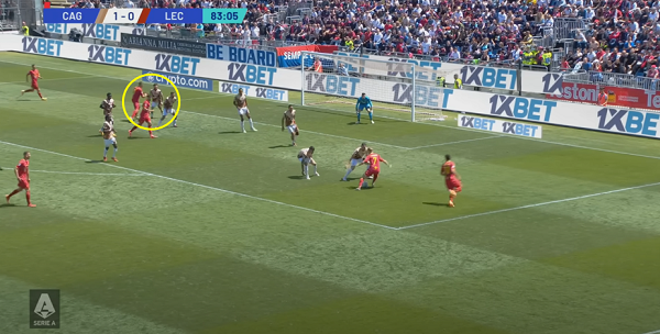Nel momento in cui Gallo supera ben tre rossoblù, arrivando in prossimità dell’area di rigore, si crea la situazione cercata a lungo dal Lecce. Il ritardo nella scalata crea una densità “sbagliata” sul lato destro della difesa del Cagliari, aprendo un ampio spazio nella zona centrale e, di conseguenza, nel lato opposto.