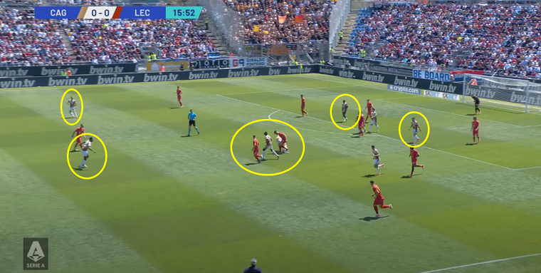 Tra i principali indiziati come responsabili del gol del pareggio del Lecce è stato indicato da più parti Makoumbou, colpevole di aver perso palla a inizio azione. Vero che il centrocampista ex Maribor è leggero nella gestione, ma non si possono dimenticare il momento della partita – e la relativa stanchezza – e l’assenza di compagni a supporto della manovra in fase di disimpegno. D’altronde Gallo, che dà il via alla transizione del Lecce, riceve il pallone appena oltre la propria metà campo e con la difesa del Cagliari schierata e tutt’altro che impreparata. Anzi, il terzino giallorosso può condurre la sfera per circa trenta metri, con una sorta di incomprensione tra Wieteska e Nández nella scalata e Makoumbou fisiologicamente in ritardo e poco coperto da uno statico Sulemana.