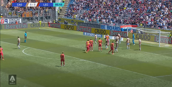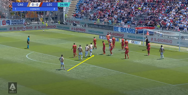 La curiosità è nello schieramento sia difensivo che offensivo delle due squadre. Che hanno scelto entrambe la stessa tipologia nelle due fasi. Da una parte la difesa a zona con il classico castello, dall’altra una linea verticale per attaccare il pallone che arriva dal corner. La differenza è nel posizionamento iniziale degli uomini d’attacco, con il Cagliari che ha scelto una partenza leggermente più lontana dalla porta di Falcone, mentre il Lecce ha puntato su una presenza più massiccia all’interno dei sedici metri. La rete del padroni di casa arriva dopo la respinta della difesa e la successiva conclusione-assist di Gaetano, il palo dei salentini direttamente dal duello aereo vinto dal centrale difensivo.