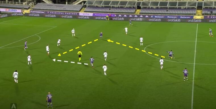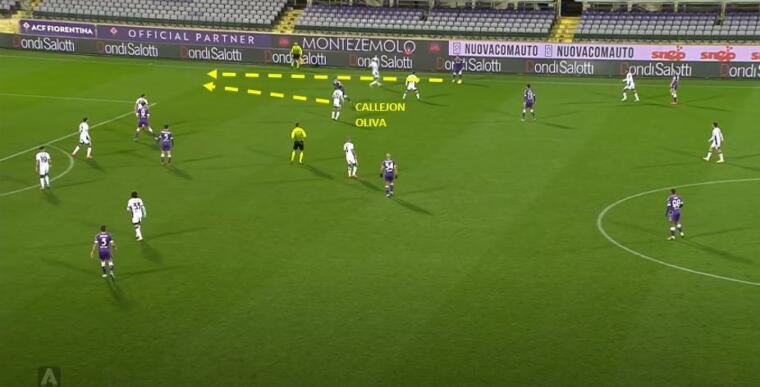 La Fiorentina nella ripresa inizia a salire di giri e a trovare le pecche di un Cagliari sempre meno reattivo e che non copre adeguatamente gli spazi. Nella prima immagine è leggibile il movimento di Callejon a dare la soluzione in verticale al compagno, i rossoblù sono uomo su uomo eppure Oliva non segue lo spagnolo creando i presupposti per l’occasione successiva di Caceres. Nella seconda immagine è evidente come manchi la copertura delle linee di passaggio sia da parte delle punte sia soprattutto a causa di un centrocampo che via via si è andato sfilacciando. La mancata lettura del primo movimento crea una reazione a catena, ogni correzione è in ritardo di un tempo e Biraghi alla fine può arrivare a concludere – alto – davanti a Cragno.