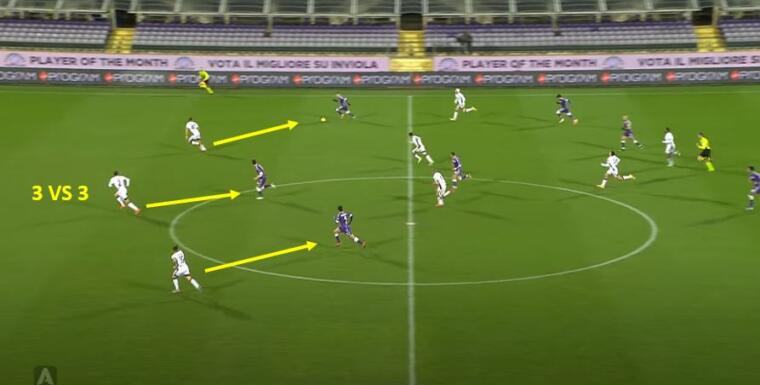 A quel punto parte il contropiede, il tre contro tre diventa una logica conseguenza, giustamente i difensori scappano all’indietro cercando di dare il tempo alla mediana di recuperare posizioni.