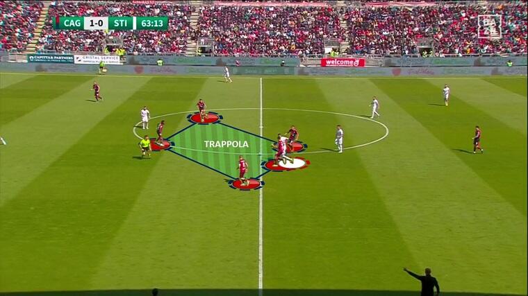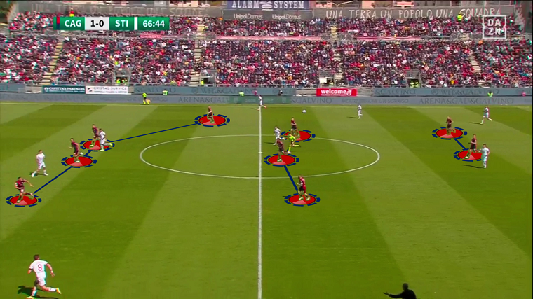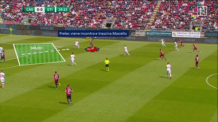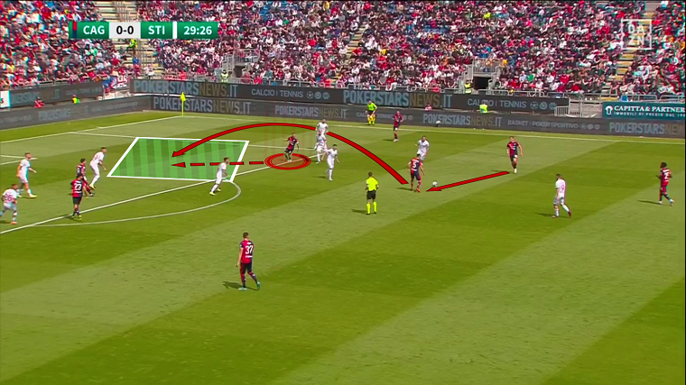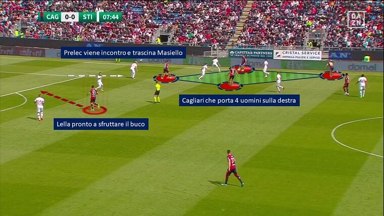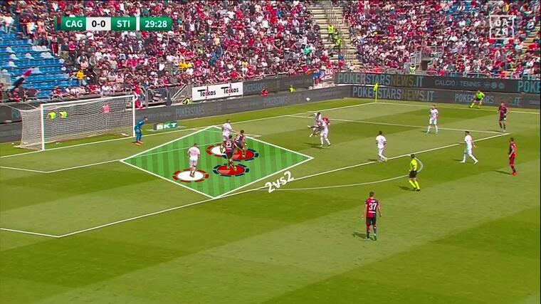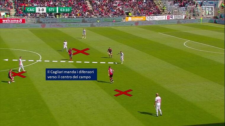 Nel primo tempo il Cagliari si è mostrato efficace non solo in fase offensiva, ma anche in fase difensiva, al di là dell’aspetto relativo alla fase di riaggressione citata in precedenza. La squadra di Bisoli ha fatto molta fatica a costruire palla a terra per vie centrali – come dimostra il 36,9% medio di possesso palla stagionale, nettamente il dato più basso del campionato – e ha preferito giocare per vie esterne con l’obiettivo di arrivare sul fondo e mettere palloni in mezzo. Ranieri ha preparato alla perfezione la partita calibrandola sulle difficoltà degli avversari: Prelec e Lapadula di fatto invitavano i difensori Zaro e Masiello a condurre per vie centrali limitando le linee di passaggio verso sull’esterno, forti del fatto che la superiorità numerica a centrocampo (4vs2) li avrebbe messi in trappola. Da queste situazioni i rossoblù hanno recuperato tanti palloni potenzialmente pericolosi.