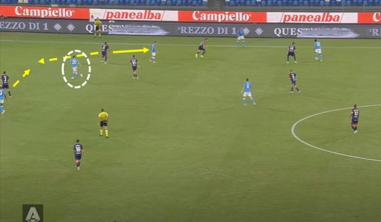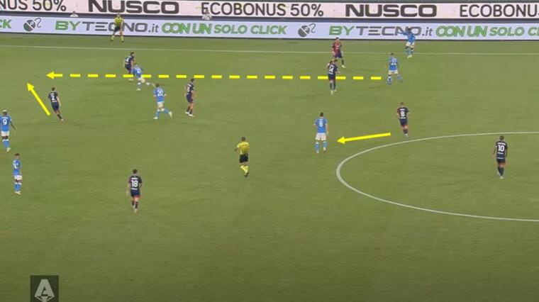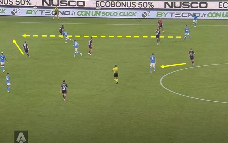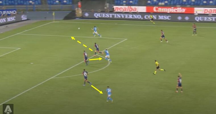 Dieci minuti e mezzo, tanto è durato il tentativo di Mazzarri di annullare la squadra partenopea. Che ha nelle verticalizzazioni a premiare gli inserimenti centrali, attraverso l’apertura dello spazio sia di Osimhen che dei trequartisti esterni, la sua arma letale. Il gol del vantaggio siglato dal nigeriano nasce appunto da un classico movimento del Napoli di Spalletti. Uno dei due mediani – Fabian o Anguissa – al lancio in profondità per lo scatto di Zielinski nello spazio tra terzino e difensore centrale avversario, con Caceres portato fuori dalla linea da Politano. Ci sono quattro situazioni da evidenziare nell’occasione. Intanto la posizione di Marin che, più che raccordo tra centrocampo e attacco, ha svolto il compito di schermo su Fabian Ruiz. Il movimento di Zielinski, che sorprende uno Strootman fin troppo statico nel non seguire l’avversario. La decisione di Caceres, che piuttosto che tenere la linea ed evitare l’apertura dello spazio difensivo, decide di andare uomo su uomo su Politano. Una scalata tra l’uruguaiano e l’olandese sarebbe stato probabilmente il movimento ideale. Infine GodÃn che non legge la giocata avversaria e resta in copertura su Osimhen piuttosto che andare a chiudere il buco tra lui e Caceres, permettendo così a Zielinski di affondare in verticale.