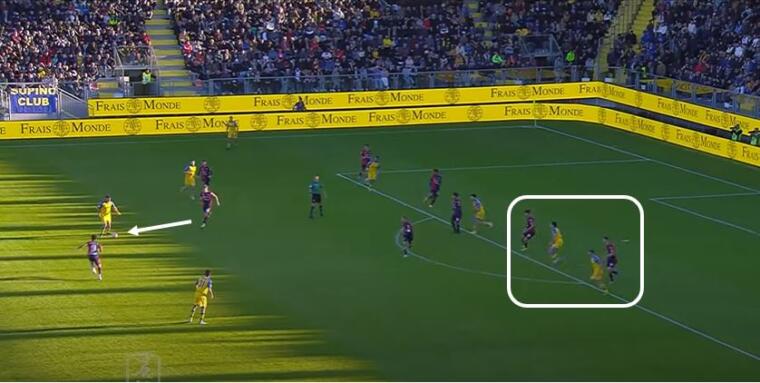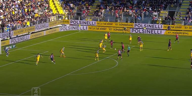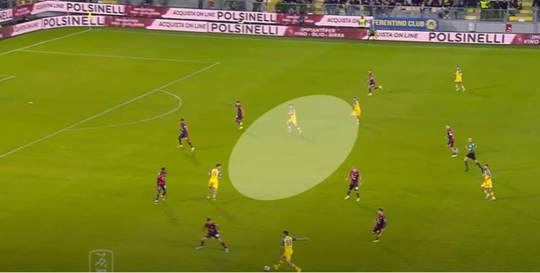 L’occasione capitata a Mulattieri, infatti, può far capire come i rossoblù stessero già apparecchiando il tavolo per il gol dei ciociari. La distanza tra Obert e Carboni ha permesso l’attacco dello spazio degli avanti gialloblù, ma soprattutto la poca aggressività sul portatore palla ha creato i presupposti per la rete poi siglata da Rodhén.