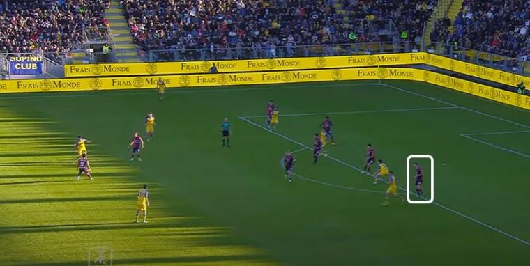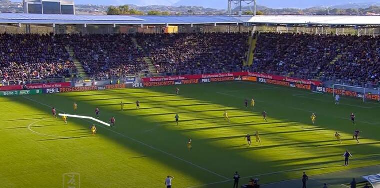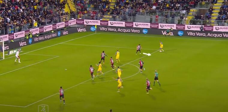 Frabotta conduce la sfera sulla zona sinistra d’attacco dei padroni di casa, centralmente lo spazio da attaccare per il Frosinone è ampio. Il centrocampo risulta assente, Makoumbou è arretrato e né Nández né Rog né Kourfalidis riescono a coprire il buco nella trequarti. Anche i centrali non leggono la situazione, Obert esce con qualche istante di ritardo permettendo lo scarico verso Insigne sul lato opposto.