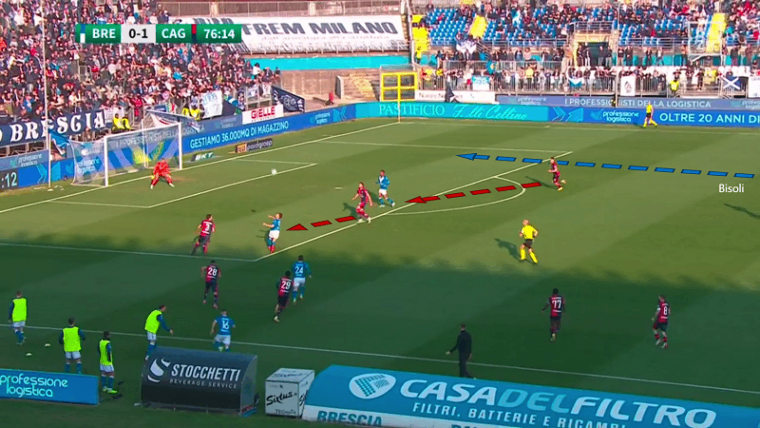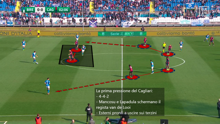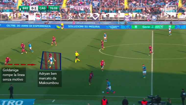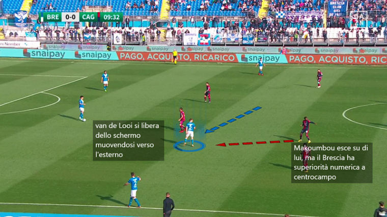 Il vertice basso del Brescia van de Looi consapevole del tentativo di schermo da parte di Mancosu e Lapadula si muove verso l’esterno in una zona intermedia tra centrale e terzino. Questa soluzione proposta da Gastaldello è stata problematica per il Cagliari. Il Brescia si schierava con un 4-3-2-1 con un focus particolare sulla densità centrale. Dato che Makoumbou e Kourfalidis stavano sulle mezzali, toccava a Dossena e Goldaniga uscire sui due trequartisti. Il movimento di van de Looi portava Makoumbou ad alzarsi su di lui e a lasciare il proprio uomo a un compagno (notate la sua gestualità nell’immagine). Dossena però non poteva alzarsi sulla mezzala lasciata libera dal congolese perché doveva stare attento al trequartista Galazzi. Di fatto le alternative per il Cagliari (o più nello specifico per Makoumbou) erano le seguenti: lasciare libero van de Looi in costruzione, o lasciare libero Galazzi tra le linee. L’opzione meno pericolosa era la prima.