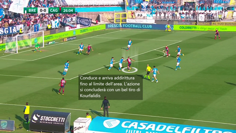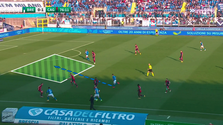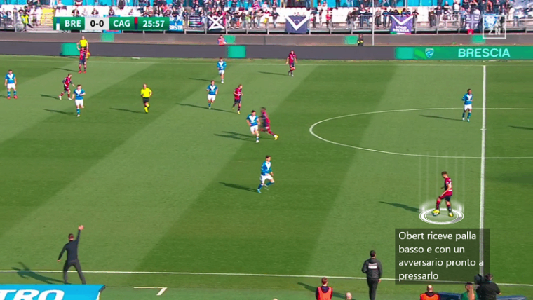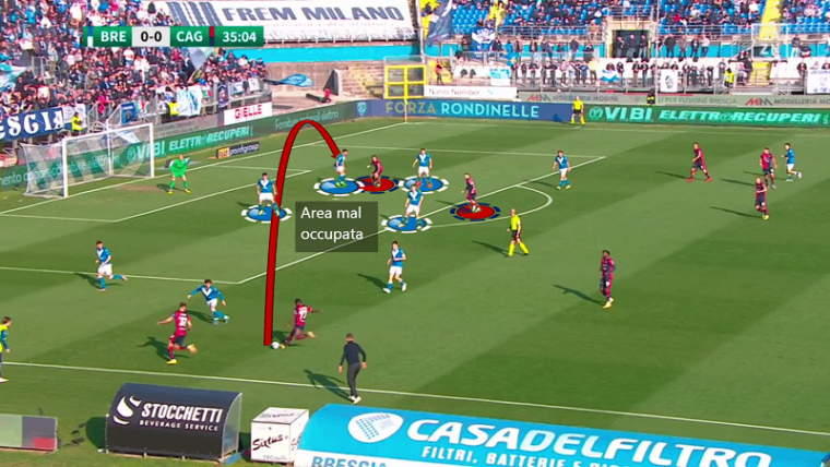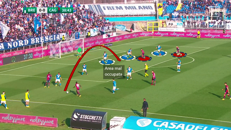 Non serve soffermarsi troppo sulla fase di non possesso, ormai è chiaro che il Cagliari di Ranieri è una squadra solida, anche se il Brescia ha creato qualche grattacapo alla retroguardia difensiva anche prima del gol di Bisoli che ha evidenziato alcune lacune individuali. È probabilmente più utile analizzare la fase offensiva della squadra in quanto lampante punto debole dei rossoblù. In questo momento ciò che manca sono sicuramente le soluzioni in avanti, pertanto è necessario che emerga la qualità dei singoli per produrre azioni pericolose. Se giocatori fondamentali come Mancosu e Nandez hanno una giornata no, allora le potenzialità offensive di questa squadre calano a picco, ancor di più se mancano per infortunio attaccanti come Pavoletti e Prelec che possono dare una soluzione ulteriore dentro l’area nel gioco aereo.