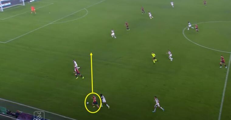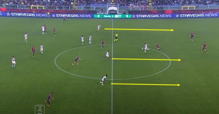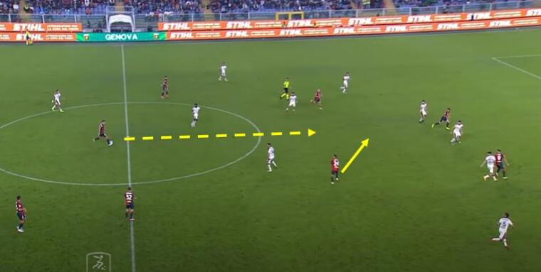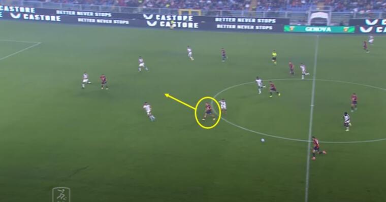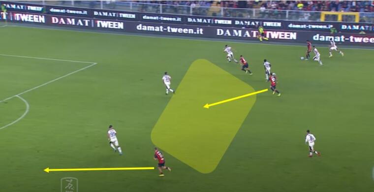 Sul lato opposto Yalcin ha trovato meno opportunità , ma quando è riuscito a saltare Obert ecco che si sono creati i presupposti per l’attacco dello spazio tra le linee di Aramu. Gudmundsson, ancora lui, ha portato via Di Pardo evitando la possibile scalata, mentre Coda ha trascinato verso di sé il duo Altare-Goldaniga permettendo all’ex Venezia di andare verso i sedici metri a rimorchio.