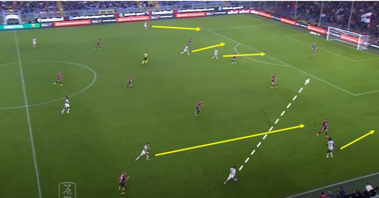 Non è quindi un caso che quando Nández prova la giocata solitaria a fine primo tempo il tutto sia possibile grazie ai movimenti senza palla dei compagni. E, soprattutto, grazie all’attacco dello spazio da parte di più uomini, partendo dalla sovrapposizione interna di Di Pardo che porta via un uomo dalla zona del Léon, passando per Luvumbo che resta largo ma attivo, arrivando a Lapadula, Deiola e Mancosu che sul lato opposto tagliano per occupare l’area genoana.
