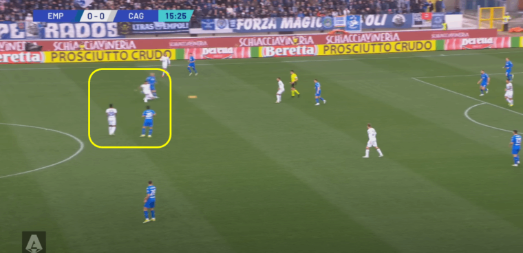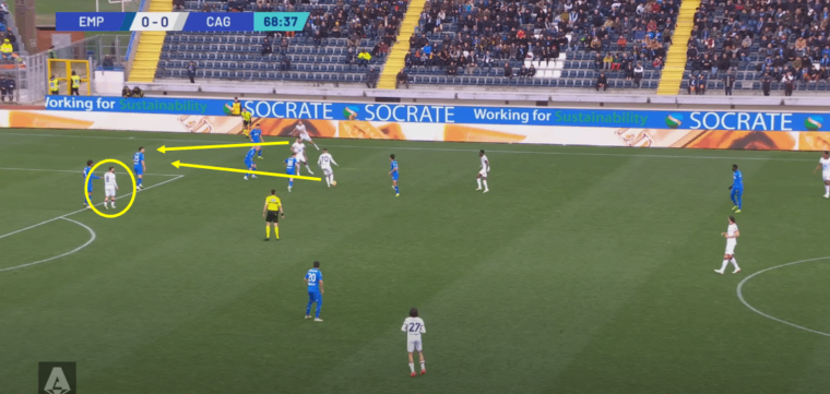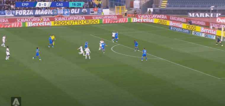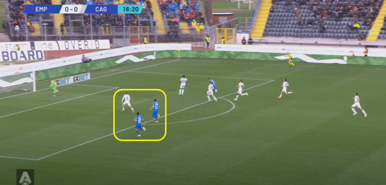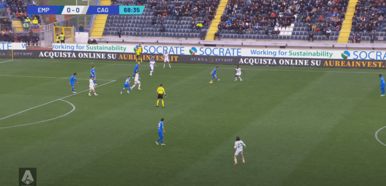 L’importanza del lavoro oscuro di Makoumbou è chiara nel momento del rigore richiesto dai padroni di casa per il tocco con la mano del numero 29 del Cagliari. Messo da parte l’episodio arbitrale in sé, è importante notare come sia l’ex Maribor nell’occasione che Deiola in altri frangenti siano sempre pronti al supporto dell’esterno basso, andando al raddoppio ed evitando pericolosi uno contro uno delle ali offensive dell’Empoli. In questa situazione Makoumbou scivola verso la linea difensiva andando a occupare lo spazio tra Mina e Zappa evitando così un pericoloso uomo contro uomo dentro l’area di rigore.