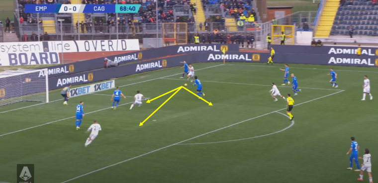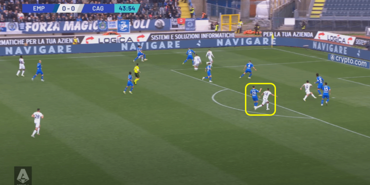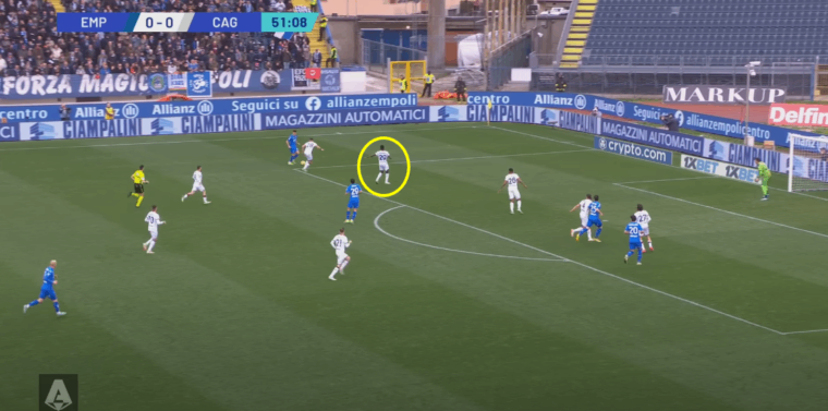 Altrettanto importante la capacità di Deiola di unire equilibrio difensivo a proiezione offensiva quando possibile. Il colpo di testa di Lapadula in chiusura di primo tempo, sventato da Caprile, ne è l’esempio più eclatante. Il Cagliari, infatti, porta più uomini che in passato a disturbare la fase difensiva degli avversari con proprio il centrocampista sangavinese che con il suo movimento distoglie l’attenzione dalla marcatura del numero 9 affidata a quel punto al solo Luperto. Il fatto che Deiola non riceva il pallone di Gaetano diventa secondario nel momento in cui la sua corsa verticale sposta il focus dell’Empoli dal solo Lapadula, permettendo così al centravanti di poter eseguire il taglio davanti all’avversario con maggiore libertà.