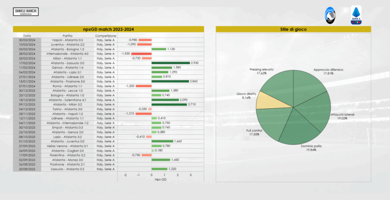 Il 3-0 rifilato al Napoli campione d’Italia uscente nell’ultimo turno ha fatto vedere un’Atalanta cinica e matura, oltre che un pizzico fortunata. Con i neroazzurri che al Maradona sono stati capaci di interrompere un periodo non troppo positivo: il successo in A mancava infatti dal 17 febbraio scorso in casa contro il Sassuolo. Un andamento che conferma come a livello di prestazioni, almeno in campionato, gli uomini di Gasperini non stessero vivendo il loro periodo migliore come si può evincere dal grafico sugli npxGD. Tuttavia, a far la differenza sono le consapevolezze di una squadra che ha sempre avuto coscienza delle proprie caratteristiche e di quanto richiesto dal proprio allenatore, che a livello tattico da anni disegna la sua squadra sul 3-4-2-1 o sul 3-4-1-2. Con le porzioni del dominio della palla o il cosiddetto full control nel grafico che testimoniano come la formazione bergamasca prediliga tenere in mano il pallino del gioco, a costo anche di concedere qualcosa agli avversari.